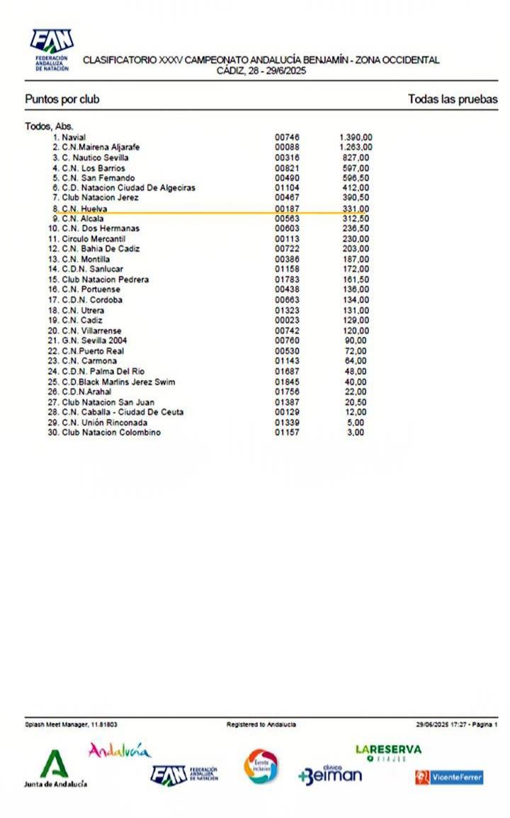 El CNH ha conseguido un destacado octavo puesto en la clasificación general por clubes, demostrando una vez más el talento y la progresión de su cantera. Más allá del resultado colectivo, el club onubense celebra el excelente desempeño individual de varios de sus nadadores, quienes han logrado clasificarse para la esperada final del Campeonato de Andalucía Benjamín, que se disputará los días 19 y 20 de julio en Málaga.